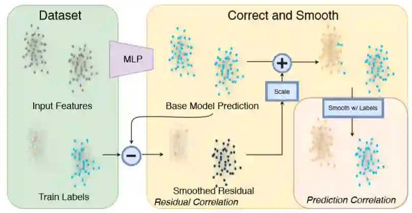 最近的研究将GNN与标签传播以及马尔可夫随机场联系起来,并且一些技术在特征中使用了标签信息。然而,这些方法的训练成本仍然很高,而本文是以两种可理解的低成本方式使用标签传播。本文从一个忽略了图结构的模型的“基础预测”开始。之后,使用标签传播进行误差修正,然后平滑最终预测。这些后处理步骤基于这样一个事实,即连接节点上的错误和标签是正相关的。