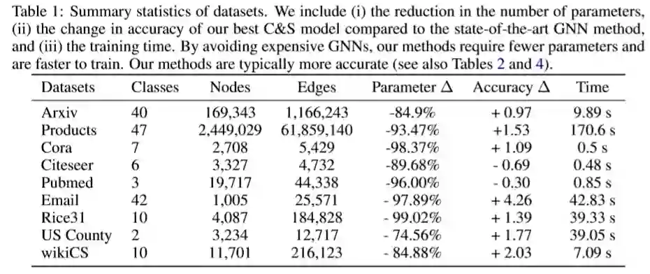总的来说,本文的方法表明,结合几个简单的思想,在传导节点分类中,无论是在模型大小还是在训练时间方面,成本都只占一小部分。例如,在OGB产品基准测试中,我们用少于两个数量级的参数和训练时间,超过了目前最著名的GNN方法。