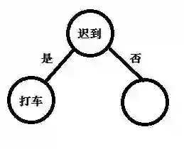 通过计算,我们看到小明是否迟到这个属性的条件信息熵最小,那么我们就将这个属性作为根结点。所以决策树的的雏形如下图。