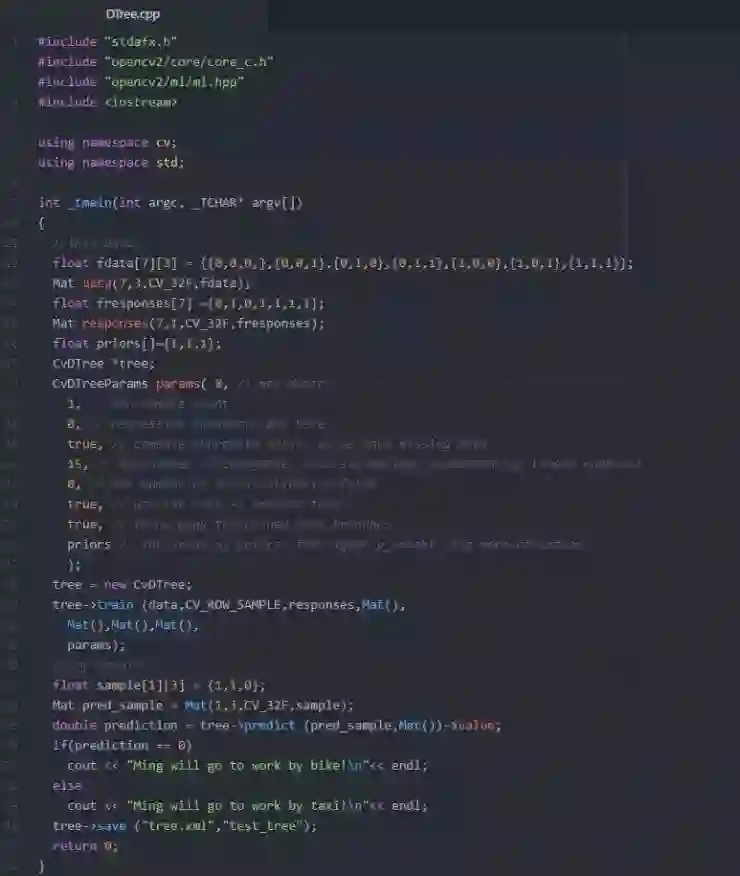因为决策树的生成在开源库 OpenCV 已经有实现,最后我再附上一段利用 OpenCV 来训练我上面例子的代码,目的也是让大家自己实现一个类似 Hello World 的程序。OpenCV 的配置方法在这里不再赘述,大家可以利用下面的代码自己作为练习。OpenCV 的内部实现过程感兴趣的同学也可以对源码进行学习,源码也可以在 OpenCV 的官网上下载到。