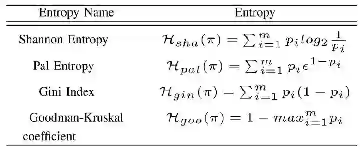 但是上面这段话怎么转化成数学的语言进行定义和描述呢,有很多学者都提出了他们认为的信息熵表达式,我们可以通过下面这个表格看一下目前的一些信息熵的定义。