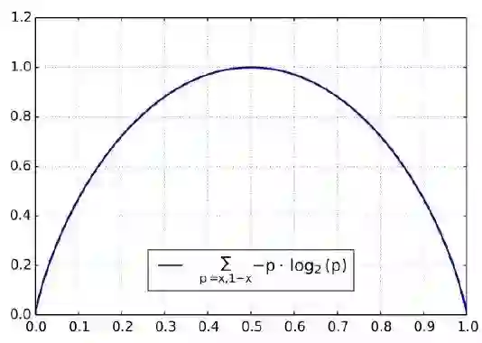 我们可以看到,这个图像所表达出来的信息和我们之前举的例子完全对应,当一个事情非常容易判断的时候,也就是我们以很大的概率认为它会发生或者不会发生,那么它的信息熵就偏向0,当一个事情非常难判断的时候,我们可以认为最难的时候就是这个事件的所有可能性均相等的时候,那么它的信息熵为1.