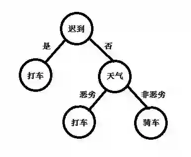 通过决策树我们很容易判断出天气恶劣、小明心情不好但是上班时间又比较充裕的情况下,小明的出行方式是选择打车。