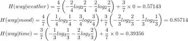 上面这个表格就是我们所说的样本集,细心的读者可能会发现,上面的样本集少了一种情况,即天气恶劣、小明心情不好但是上班时间又比较充裕的这种情况,没错,我故意省去这一组就是想让这一组成为测试集,让大家通过构建一个决策树来预测在这种情况下,小明会采取哪一种方式上班。