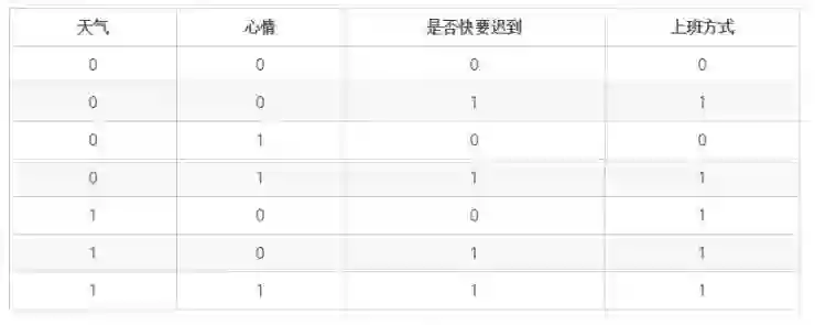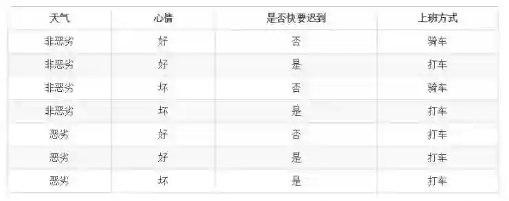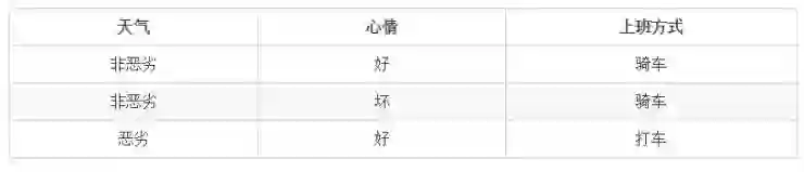 假如小明上班可以选择两种交通工具,一种是网约车打车上班,一种是骑共享单车上班。采取这两种途径中的哪一种取决于三个因素,一个是天气情况,天气假设可分为恶劣天气和非恶劣天气,另一个因素是小明的心情,心情分为好心情和坏心情,最后一个因素是小明是否快要迟到。假设三个因素对应的小明上班方式的情况如下表: