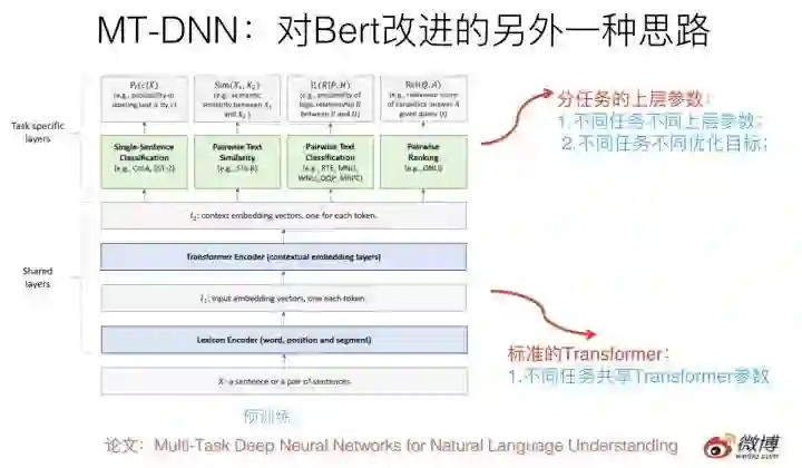 这种做法一个典型的模型是最近微软推出的MT-DNN,改进思路就如上所述,可以参考上图示意。核心思想如上,结构上底层就是标准的Bert Transformer,在上层针对不同任务构造不同优化目标,所有不同上层任务共享底层Transformer参数,这样就强迫Transformer通过预训练做很多NLP任务,来学会新的知识,并编码到Transformer的参数中。