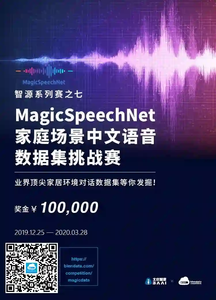 2019 年 12 月,北京智源人工智能研究院联合爱数智慧和数据评测平台 biendata,共同发布了“智源—MagicSpeechNet 家庭场景语音数据集挑战赛” (2019 年 12 月 — 2020年 3 月),总奖金为 10 万元。参赛者需要使用比赛提供的真实家庭环境中的双人对话音频数据,训练并优化语音识别(ASR)模型。比赛和数据复制下方链接查看,或点击“阅读原文”。