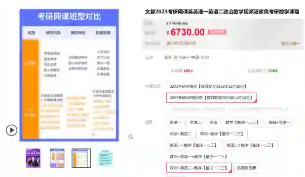 以文都考研为例,在其天猫官方旗舰店,其政治英语数学三门公共课开设的2023考研VIP特训班售价6730,商品详情页面介绍改班型区别于普通全程班,其享有学习计划、学管督学、心理疏导等服务。