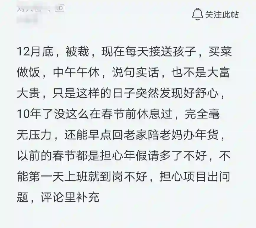 一名程序员在年前被裁员了,也许是塞翁失马,焉知祸福,借着这段被裁员的日子,这名程序员索性开始放松享受生活:12月底被裁,现在每天接送孩子买菜做饭,中午午休,说句实话也不是大富大贵,只是这样的日子突然发现好舒心,十年了没这么在春节前休息过,完全毫无压力,还能早点回老家陪老妈办年货,以前的春节都是担心年假请多了不好,不能第一天上班就到岗不好,担心项目出问题。