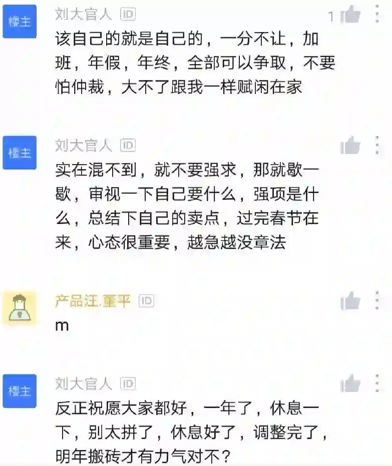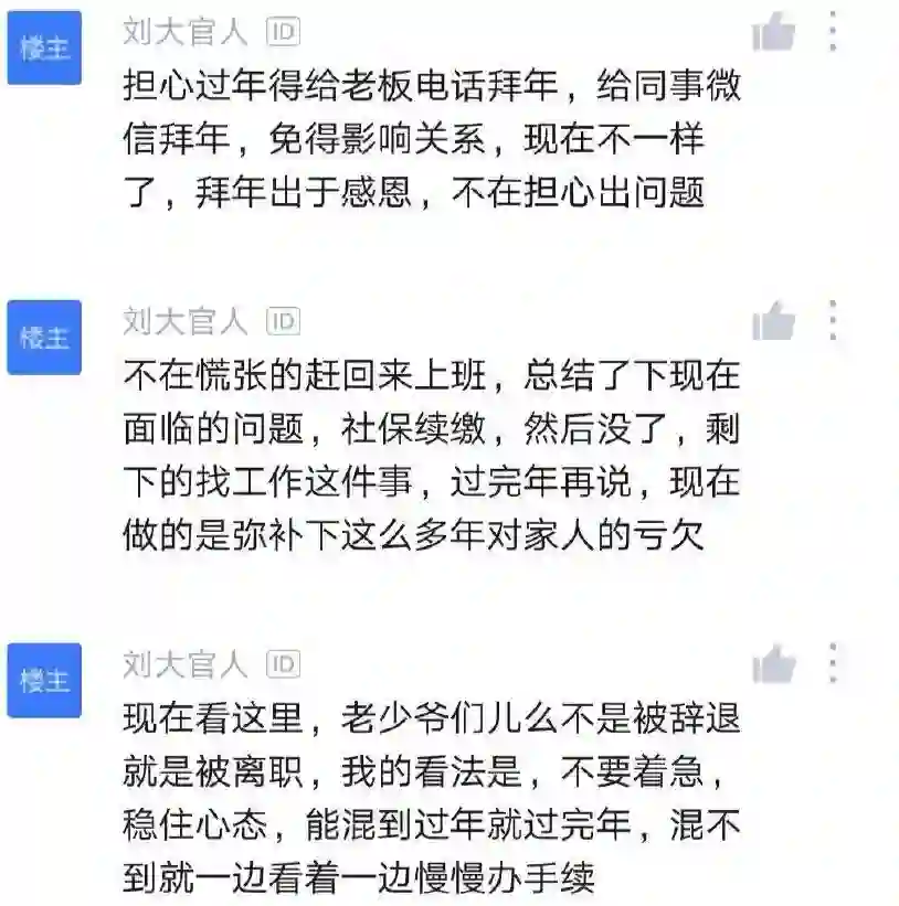 担心过年得给老板电话拜年,给同事微信拜年,免得影响关系,现在不一样了,拜年出于感恩,不在担心出问题,不在慌张的赶回来上班,总结了下现在面临的问题,社保续缴,然后没了,剩下的找工作这件事,过完年再说,现在做的是弥补下这么多年对家人的亏欠。现在看这里,老少爷们儿么不是被辞退就是被离职,我的看法是,不要着急,稳住心态,能混到过年就过完年,混不到就一边看着一边慢慢办手续,该自己的就是自己的,一分不让,加班,年假,年终,全部可以争取,不要怕仲裁,大不了跟我一样赋闲在家。