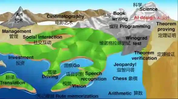 那么一个问题是:AI最终将上升到多高的地方?海面最终会将所有的陆地覆盖吗?像下面这张图这样,AI在几乎所有任务中都达到了人类水平?