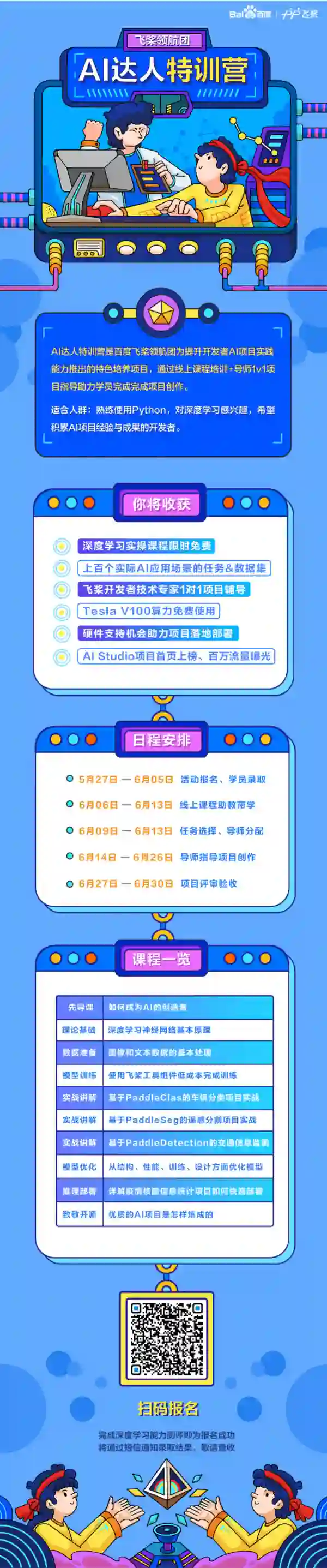 AI达人特训营面向所有有Python基础且对深度学习感兴趣的小伙伴开放,扫码并完成能力测试即为报名成功,我们将根据测试分数择优录取并分配任务和导师,录取通知将通过短信发送,敬请查收。