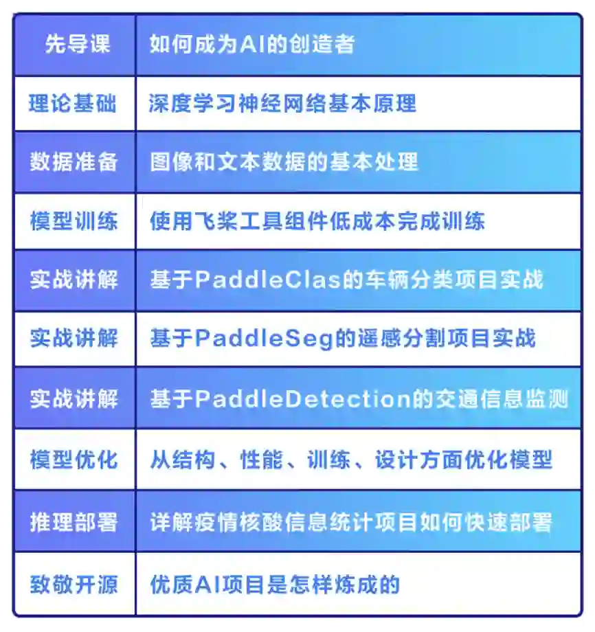 AI达人特训营是百度飞桨领航团为提升学生和在职开发者的AI项目实践能力推出的特色培养方案。通过线上课程培训+技术专家1v1项目指导,快速提升你的项目实践能力;更有上百个实际应用场景下的AI任务+数据集供你挑选实践,AI项目经验buff快速叠加,参赛拿奖触手可及。