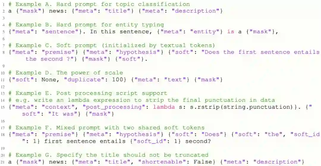 实际上,prompt learning 发展到现在,有各种各样的 template 和 template 组合。在做实验的时候,设计各种各样的 template 的实现成本是比较高的,很难实现快速迭代和尝试。为了解决这一痛点,作者设计一种 template language 来统一各种各样的 template 设计,然后用一个统一的函数去解析 template。