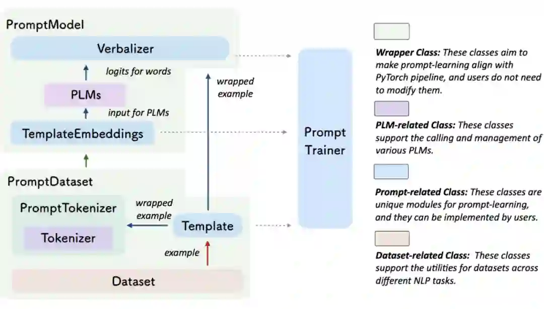 从上图不难看出,OpenPrompt 提供一套完整的 Prompt Learning Pipeline,而其中每个 class 都继承了 torch 的类或者 huggingface 的类来实现,完美兼容最流行的深度学习框架和最流行的预训练模型框架,在代码风格和 pipeline 设计上也是完美贴合 huggingface 框架,让研究者可以以最少的学习成本上手和修改。
