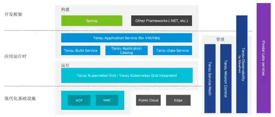 管理应用类产品辅助运行应用类产品,服务于云原生基础平台。包括 Tanzu Observability 和 Tanzu Mission Contral 两款,分别用于现代化应用的监控、分析和批量化的集群管理。