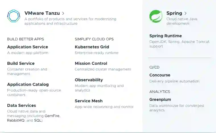 在矩阵图的规划下,Tanzu 产品家族共包含 10 个产品(不包括 Spring 开源框架)和 1 个服务,分别是: