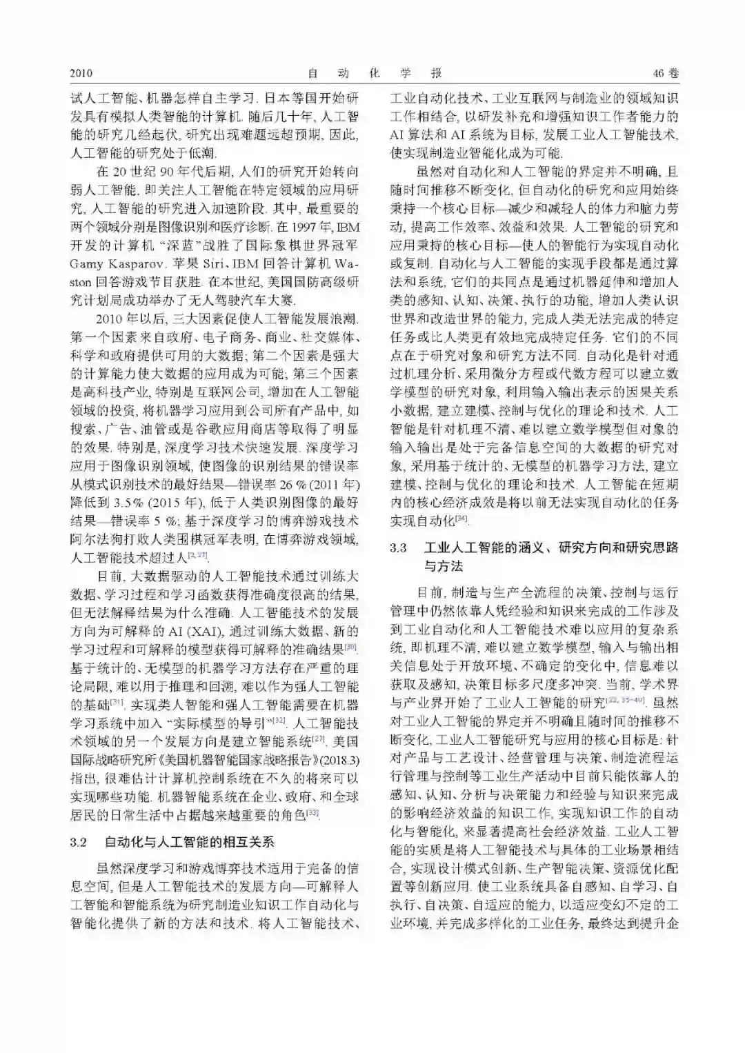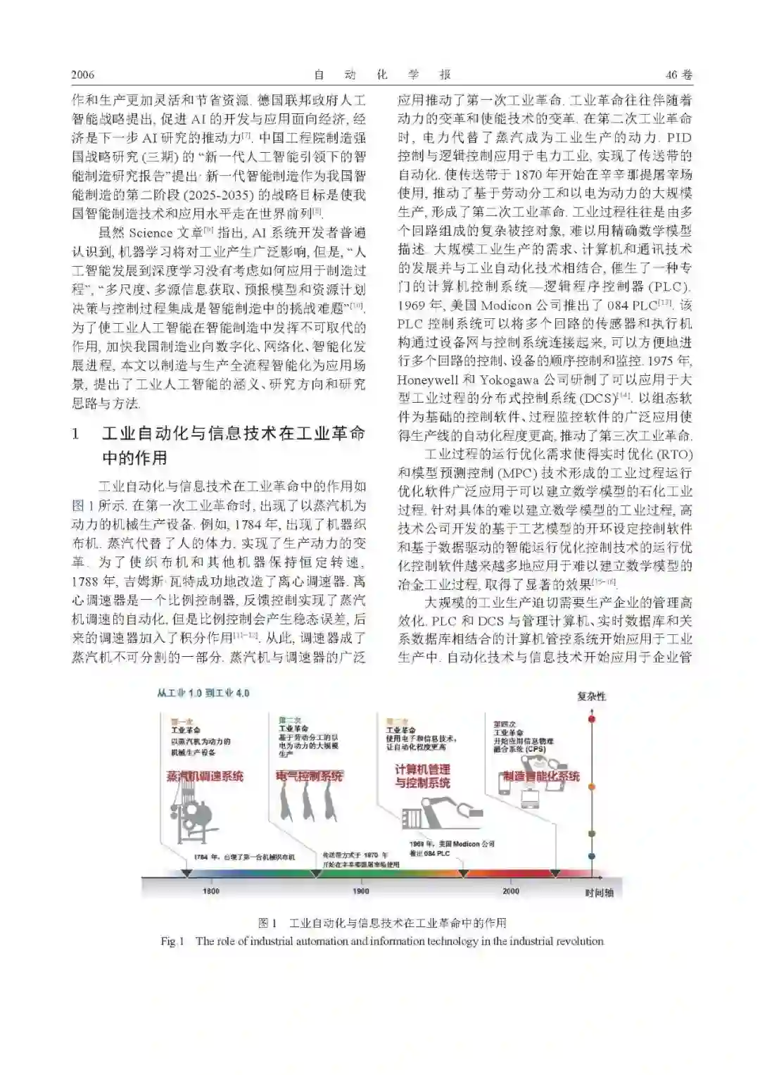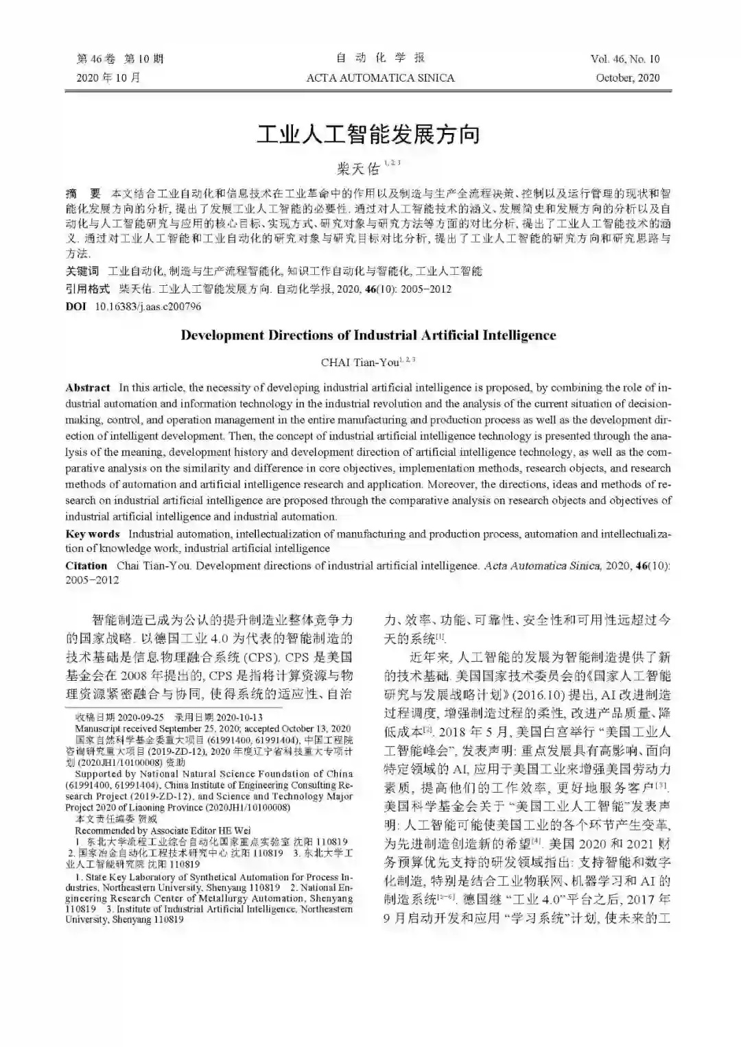 本文结合工业自动化和信息技术在工业革命中的作用以及制造与生产全流程决策、控制以及运行管理的现状和智 能化发展方向的分析, 提出了发展工业人工智能的必要性. 通过对人工智能技术的涵义、发展简史和发展方向的分析以及自 动化与人工智能研究与应用的核心目标、实现方式、研究对象与研究方法等方面的对比分析, 提出了工业人工智能技术的涵 义. 通过对工业人工智能和工业自动化的研究对象与研究目标对比分析, 提出了工业人工智能的研究方向和研究思路与方法。