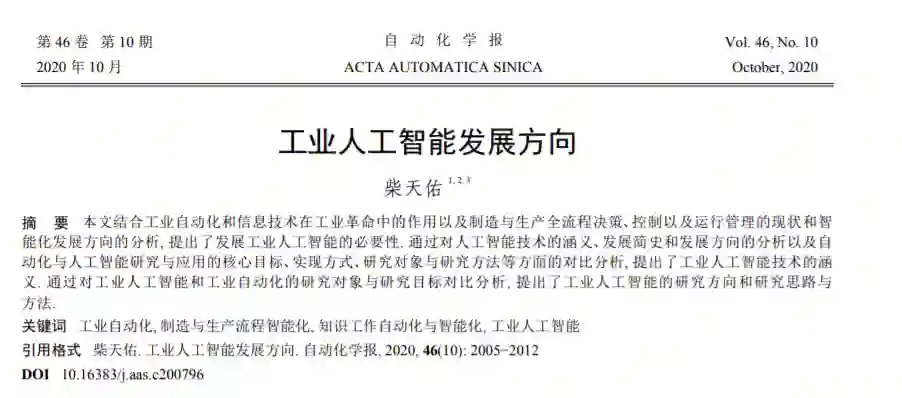 后台回复“工业人工智能” 可以获取《柴天佑院士:工业人工智能发展方向》专知下载链接索引