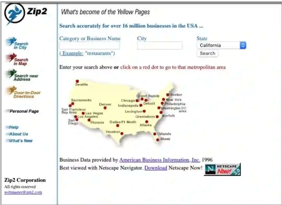 作为一个在线城市指南,Zip2很快为《纽约时报》和《芝加哥论坛报》的新网站提供内容。1999年,康柏电脑公司的一个部门以3.07亿美元现金和3400万美元股票期权的价格收购了Zip2。