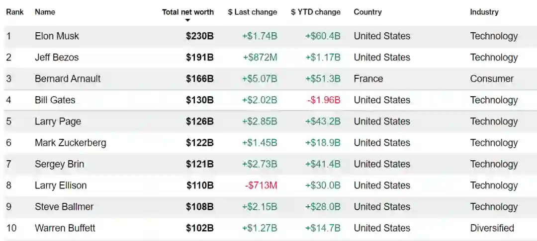 这份榜单显示,50 岁的马斯克的净资产达到了惊人的 2300 亿美元,排名高居榜首。盖茨以 1300 亿美元排名第四,巴菲特以 1020 亿美元排名第十。而这两位都曾经当过世界首富。