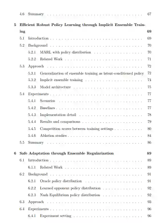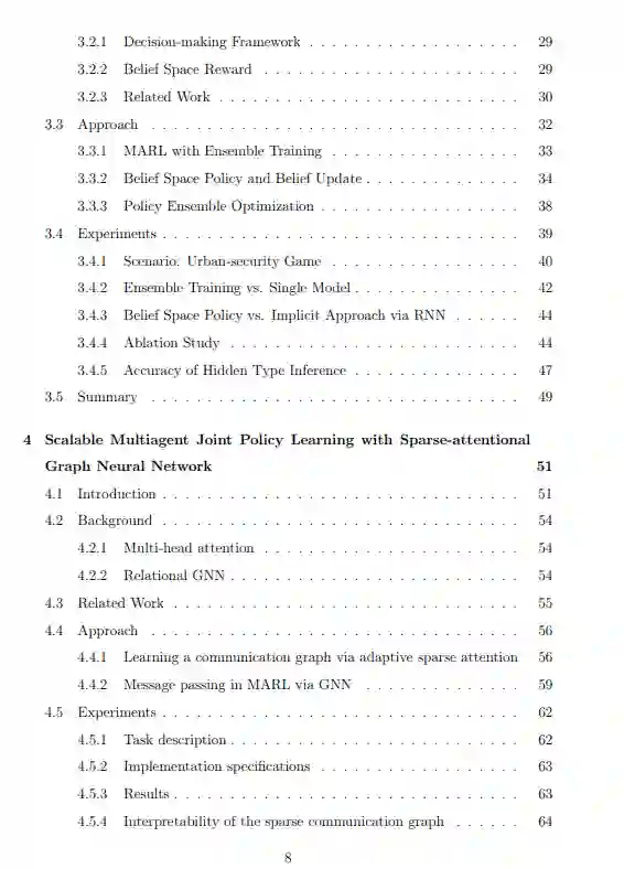 在许多现实世界的应用中,多主体决策是一个普遍存在的问题,如自动驾驶、多人视频游戏和机器人团队运动。多智能体学习的主要挑战包括其他智能体行为的不确定性,以及由联合观察、行动和策略空间的高维性导致的维数灾难。由于未知的智能体意图和意外的、可能的对抗性行为,这些挑战在对抗性场景中进一步加剧。本文提出了鲁棒和可扩展的多智能体学习方法,目标是高效地构建可以在对抗性场景中鲁棒运行的自主智能体。通过观察智能体的行为准确推断其意图的能力是鲁棒决策的关键。在这种情况下,一个挑战是对手实际行为的高度不确定性,包括潜在的欺骗,这可能与先验行为模型有很大的不同。捕捉自我主体和对手之间的交互以及对双方主体可用信息的推理,对于建模这种欺骗行为至关重要。本文采用博弈论对手建模方法解决了这一意图识别问题,该方法基于一种新的多样性驱动的信念空间集合训练技术,用于实现对欺骗的鲁棒性。为了将集成方法扩展到具有多个智能体的场景,本文提出了一种可扩展的多智能体学习技术,该技术通过稀疏注意力机制促进了接近最优的联合策略学习。该机制的结果是集中的参数更新,这大大提高了采样效率。此外,本文还提出了一种新的隐式集成训练方法,该方法利用多任务学习和深度生成策略分布,以较低的计算和内存成本获得更好的鲁棒性。将鲁棒的意图识别和可扩展的多智能体学习结合起来,可以实现鲁棒的、可扩展的离线策略学习。然而,完全自主的智能体还需要能够不断地从新的环境和对等智能体中学习(并适应)。因此,本文还提出了一种安全的适应方法,既能适应新的对手,又能在对抗场景中对任何可能的对手剥削保持低可利用性。本文的贡献有助于构建自主代理,使其能够在具有不确定性的竞争多智能体场景下做出鲁棒的决策,并通过计算效率学习安全地适应以前未见的对等智能体。