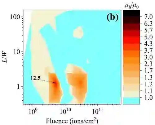 在低注量(~109 ions/cm2 )下,快重离子辐照会提升GFET的性能,在较高注量(~1011 ions/cm2)下,GFET性能明显退化。当石墨烯带长宽比小于5时,离子注量109ions/cm2 - 4×1010ions/cm2范围辐照后,GFET的电阻值减小(如图1),载流子迁移率增大(如图2)。