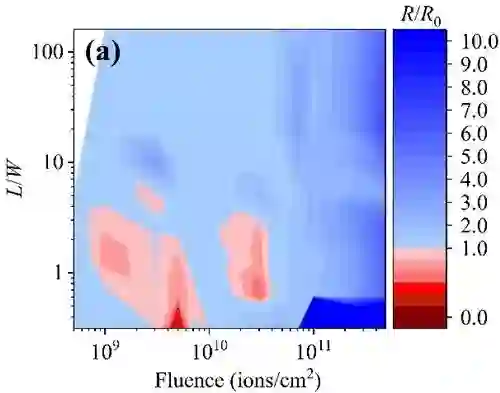 研究人员设计并制备了360个具有不同长宽尺寸的石墨烯带的背栅型场效应晶体管(GFET)。基于兰州重离子加速器,通过改变入射离子的能量和电子能损,采用不同注量(5×108ions/cm2 – 5.4×1010 ions/cm2)的Ta束辐照GFET。对比不同辐照注量条件下石墨烯的电学性质变化,发现