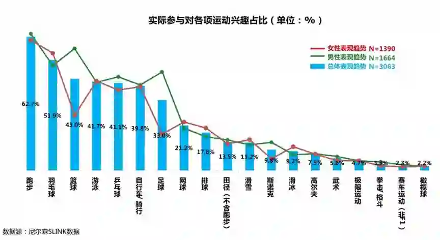而对于运动兴趣偏好表现,消费者呈现出了明显的集中度:跑步成为参与度最高的项目,男、女比例都超过了60%。跑鞋产品成为近3年最受欢迎的品类,复购率也是最高。