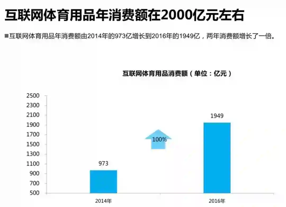 根据《2017互联网体育消费报告》,2016年体育相关方面的融资事件达到了235起,融资金额接近200亿元。互联网体育用品的年消费额由2014年的973亿增长到2016年1949亿,两年消费额增长了一倍,市场需求巨大。