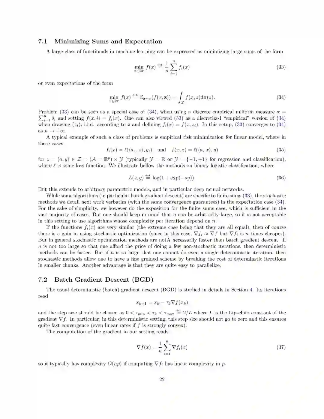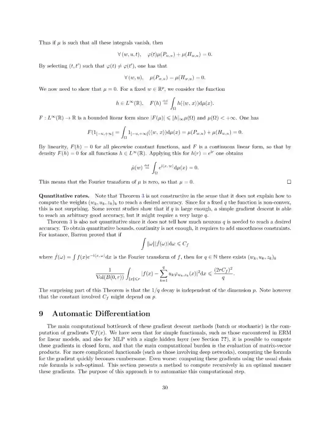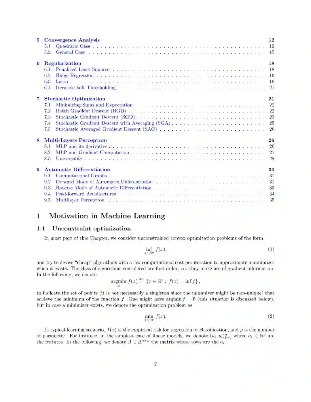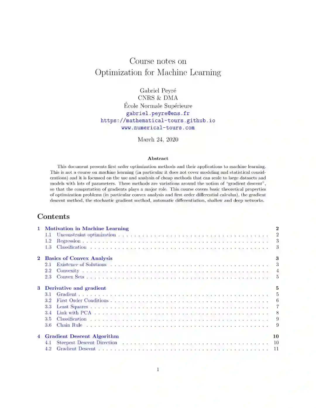 本文介绍了一阶优化方法及其在机器学习中的应用。这不是一门关于机器学习的课程(特别是它不涉及建模和统计方面的考虑),它侧重于使用和分析可以扩展到具有大量参数的大型数据集和模型的廉价方法。这些方法都是围绕“梯度下降”的概念而变化的,因此梯度的计算起着主要的作用。本课程包括最优化问题的基本理论性质(特别是凸分析和一阶微分学)、梯度下降法、随机梯度法、自动微分、浅层和深层网络。