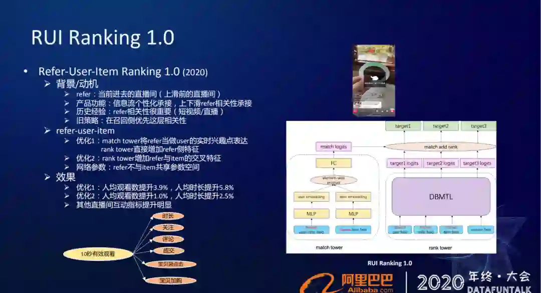 最后一点,这样全屏式的场景下,怎么去做目标的刻画的?在这个场景下,是没有像信息流式有用户的点击行为,所以在这个场景下,我们用的是一个10秒有效观看率。我们认为10秒观看行为才是有效的,所以我们的一跳的目标就定义为10秒有效观看率,在这个前序目标下,才会有时长、关注、评论、成交,然后宝贝袋点击、宝贝加购的这些目标。