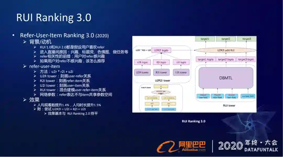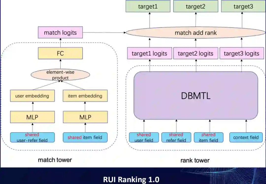 在2.0版本我们就做了简单的优化,左边的match tower,原来是先去刻画user和item的关系,现在直接换成了refer和item的关系刻画,还是原来的点积的框架match tower,只是把原先user的特征换成了refer特征,然后显式的去刻画refer和item的关系。
