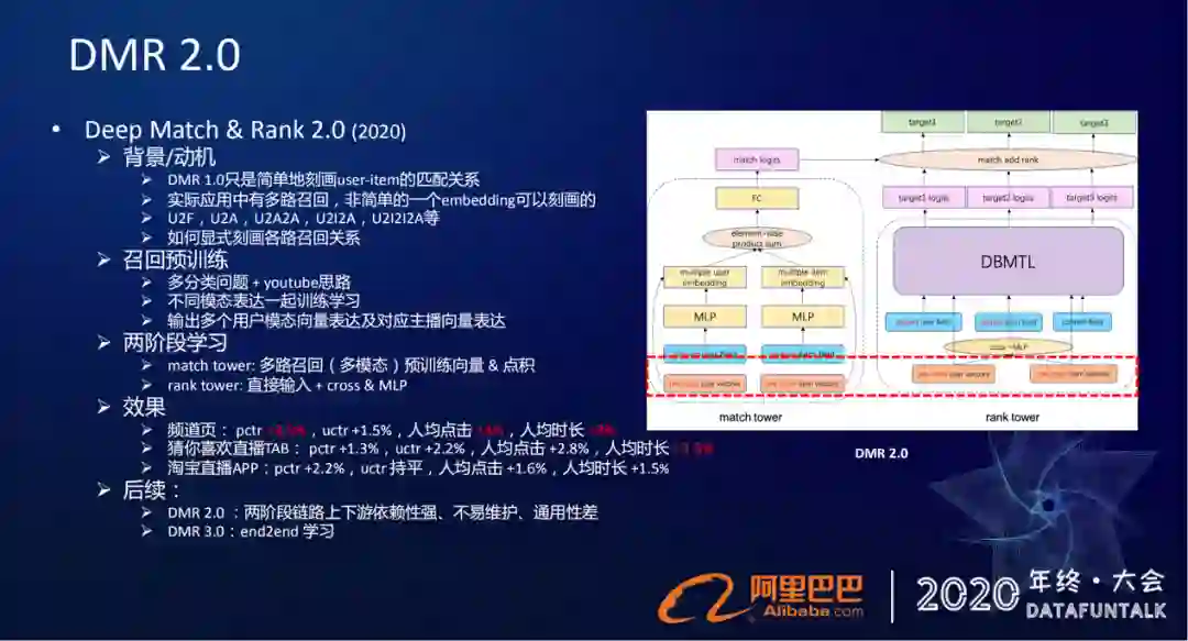 今年我们围绕着召回匹配建模提出了一个双塔的DMR框架,然后我们又做了一个两阶段的召回匹配学习。此外我们也在全屏页直播间上下滑做了基于业务特性上优化的一些工作。