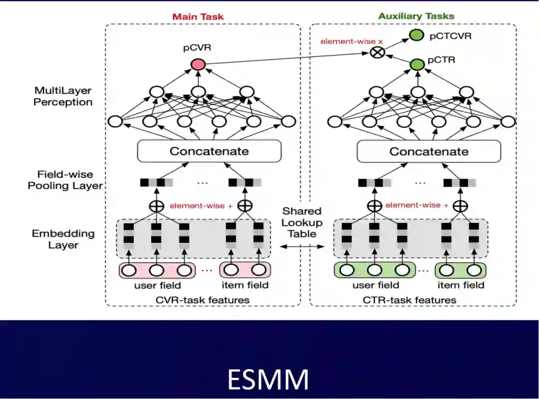 这张图是阿里巴巴的ESMM,它最初的一个目标是要去优化pCVR,然后通过引入pCVR=pCTR*pCTCVR这样的目标关系刻画,解决了样本选择空间偏差的问题,进一步优化pCVR。