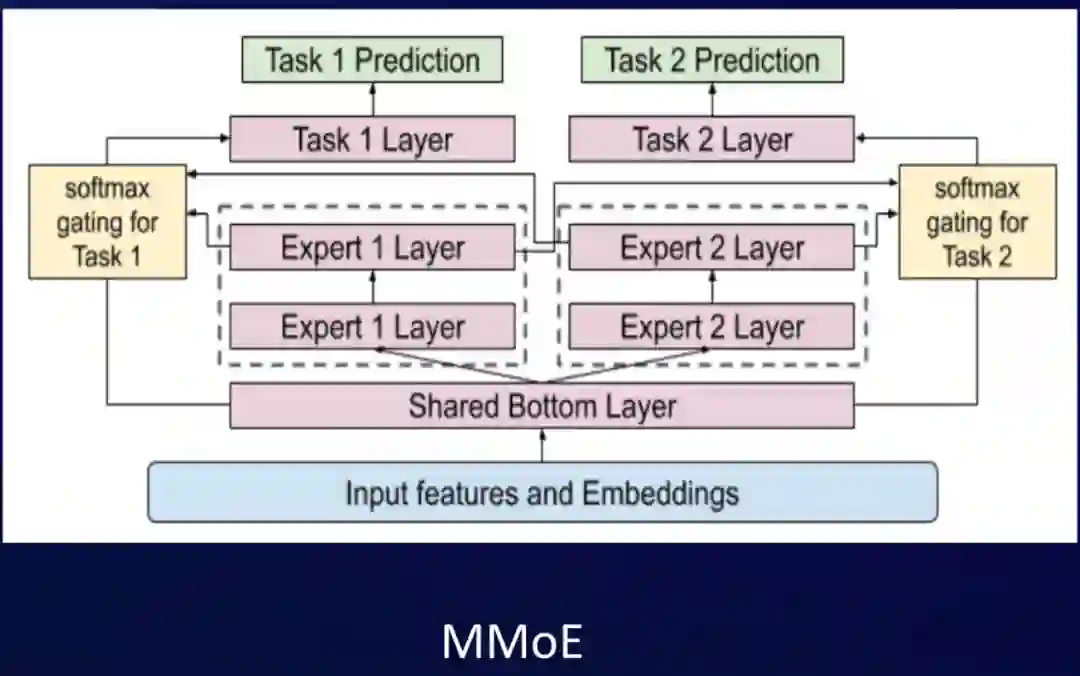 我们在2.0版本做了升级,引入了MMoE的soft parameter sharing方法。它的作用就是在信息共享层,将原来hard parameter sharing的share-bottom的方法替换为MMoE这种soft parameter sharing的方法。