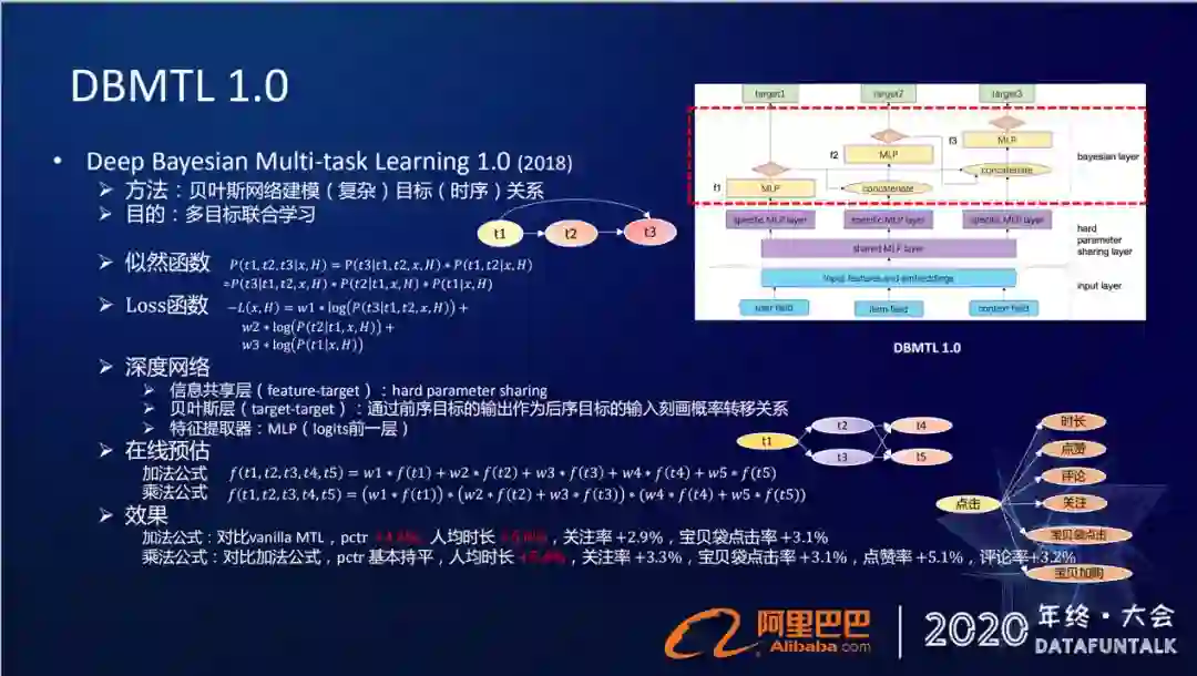 DBMTL1.0的优化。主要是通过贝叶斯层去刻画了目标与目标之间的时序关系,然后在信息共享Feature-target层,还是采用原来的这种hard parameter sharing的方法。这种底层特征的共享方法,在随着目标越来越多的情况下,网络规模就会越来越大。