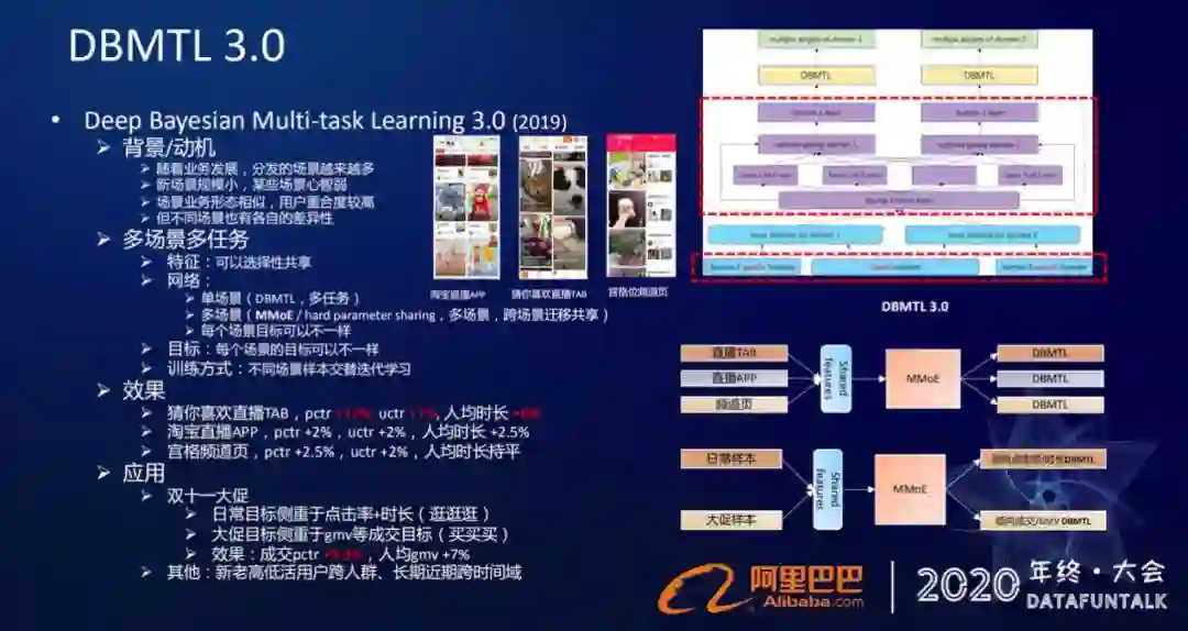 上图的时间轴,展示的是从2018年至今,淘宝直播做的排序优化工作。从2018年开始,我们就将排序模型升级到了原生的多目标学习框架MTL ( Multi-task Learning )。在2018年底我们基于目标持续建模,提出了自己的多目标学习框架DBMTL,2019年结合MMoE对框架进行升级,又做了多场景多任务的网络框架。今年围绕着召回匹配建模做了DMR架构,还做了两阶段召回匹配的模型,这些是我们在淘宝直播的列表页信息流下做的一些优化工作。