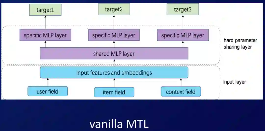 为每个目标单独去建立一个模型,这种方案可能会面临着成本高的问题。另外有些目标会面临着数据稀疏的问题,更重要的是忽略了目标间之间的信息共享关系。比如一个5秒钟的点击和一个5分钟的点击,它带来这个效果是不一样的,如果能把这种时间上的信息作用到点击上,也是可以提升点击效果的。