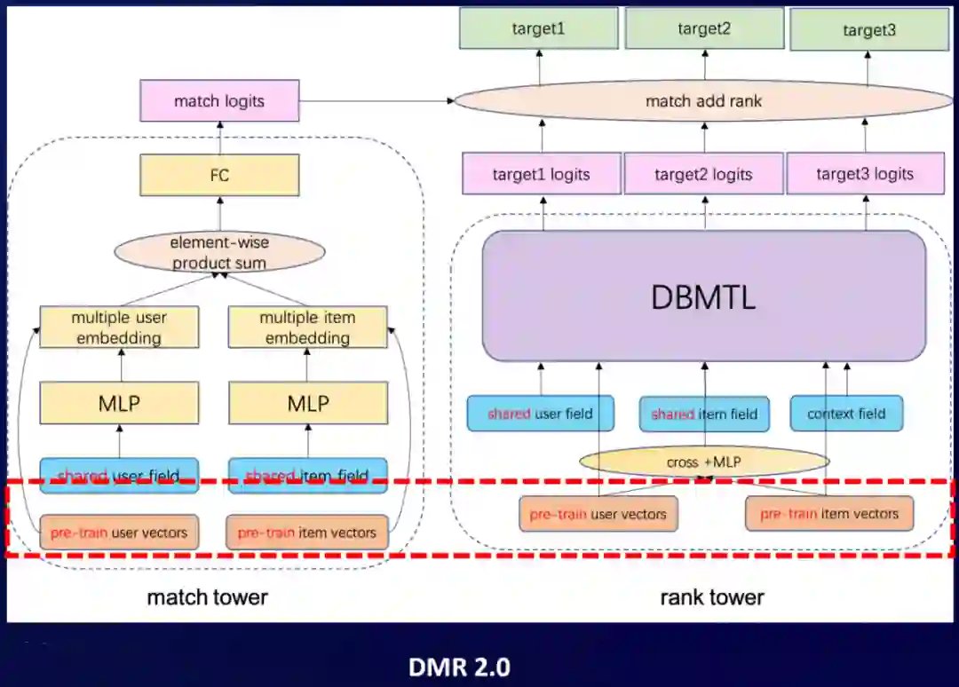 首先,在match tower里面,因为我们在pre-train的这些向量已经在空间里面得到表征,直接喂到上面点积的操作就可以了。直接给他们做一个点乘的操作,然后再跟原来得到的这个embedding去做一个sum pooling或mean pooling,过FC,得到logits。在rank tower里,我们同样把预训练好的一些特征,输入到网络里面去。