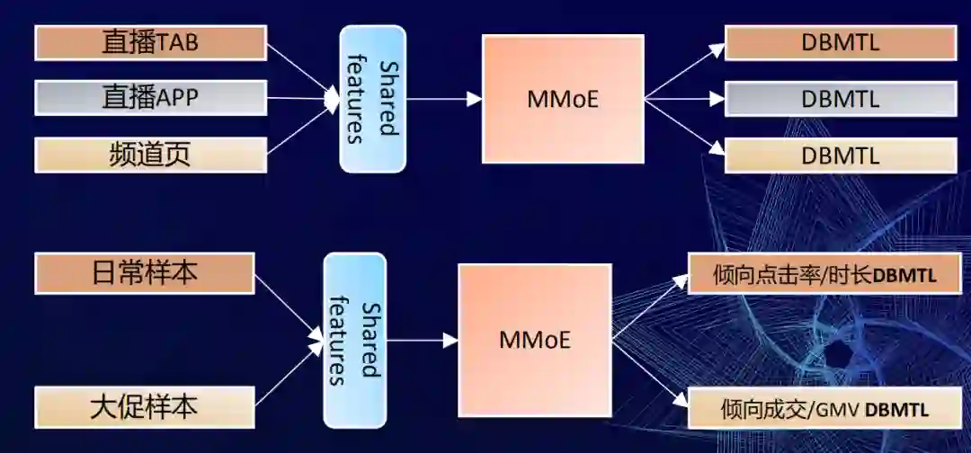 我们就将样本就切成两块,一块就是日常的样本,在日常场景里面,用户可能是来逛逛逛,所以优化侧重点击率+时长。另外一块是大促期间的样本,在双十一大促的时候大家会来这里买买买,所以双十一的样本我们会注重GMV等一些相关成交的目标优化。