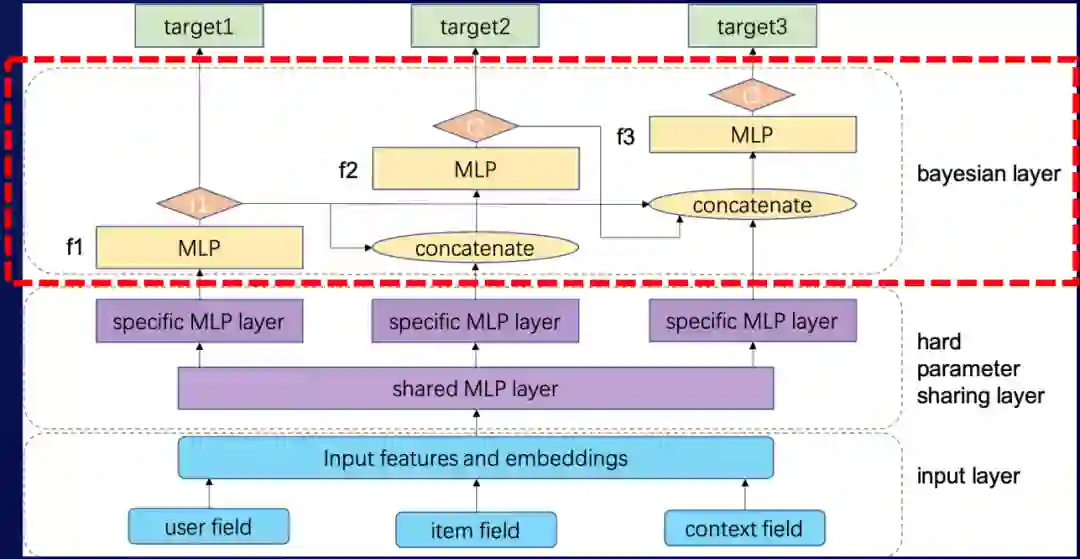 贝叶斯关系的刻画是在target-target层。基本的原理是通过前序目标的输出作为后续目标的输入来刻画它们的转移关系,概率关系的刻画是通过一个简单的MLP(输出的Logits的前一层)来刻画的。