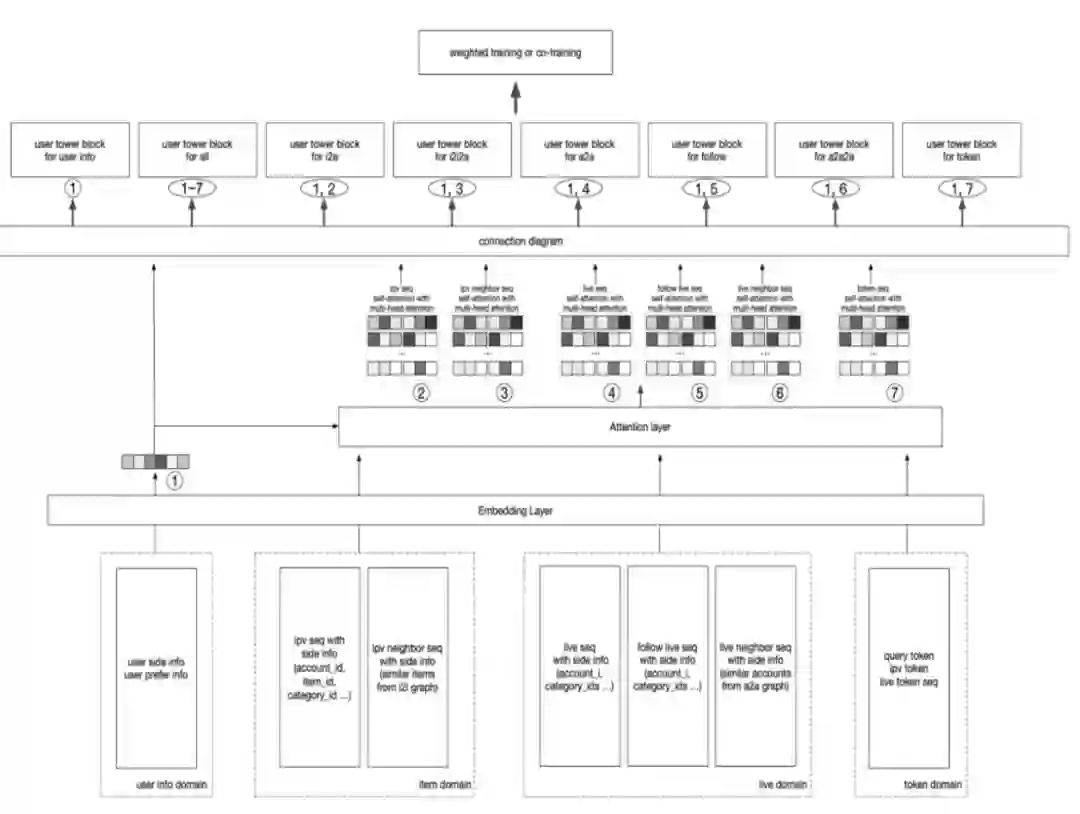 在这个框架图底层就是用户的输入的各个模态下的序列,每个序列会带上它的一些side-information,这些序列再往上层走的时候,会过一个基于transformer的share attention的特征抽取,然后再往上层才得到用户在不同召回模态下的表征。