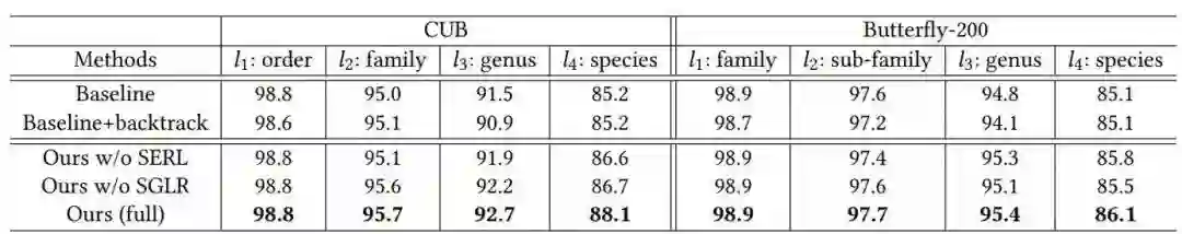 为了评估提出的框架其有效性,作者扩展了 Caltech-UCSD birds 数据集 (Extended CUB),将其组织成具有目、科、属、种四个层级分类结构。同时,作者还构建一个大规模的蝴蝶数据集 (Butterfly-200),其类别标注同样覆盖了四个层级。