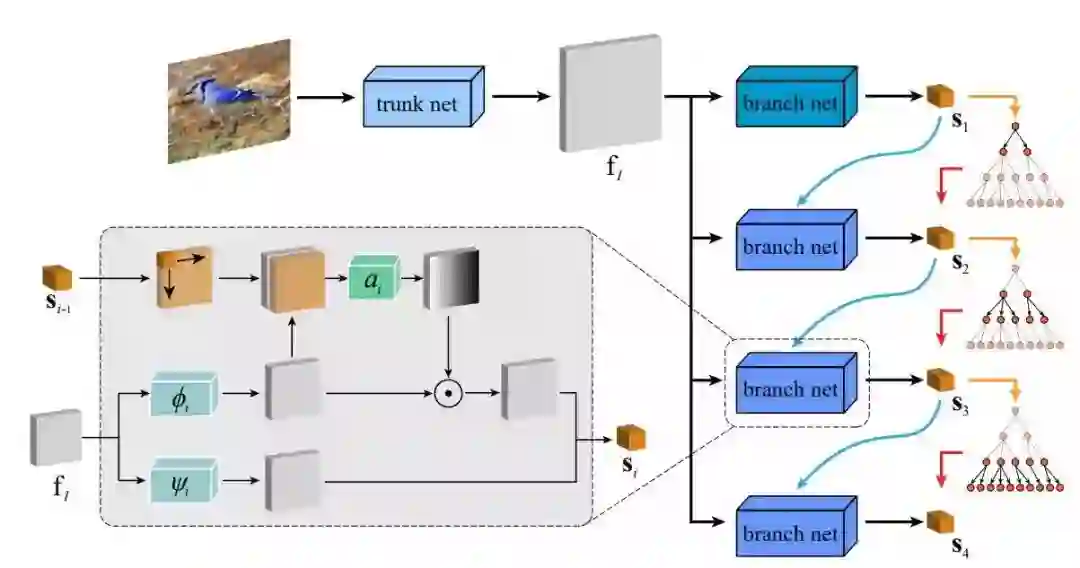 一般来说,物体的类别可以按照不同程度进行概念抽象,由此形成了层次化的分类结构。例如,鸟类 (鸟纲) 可以按照目、科、属、种四个层级分类。这种层次化信息编码了不同层级的类别之间的关联关系,可以作为一种先验信息有效的规范语义空间。比如说,若要识别给定物体的细粒度类别 (例如,鸟「种」的类别),作者可能先识别出它的超类 (例如,鸟「属」的类别)。然后,作者会更倾向于专注在那些属于这个超类的细粒度类别,进而专注于可以为区分这些细粒度类别提供更多判别信息的物体区域。然而,目前的方法仅仅着眼于单个层级的类别,却忽略了丰富的结构化信息。