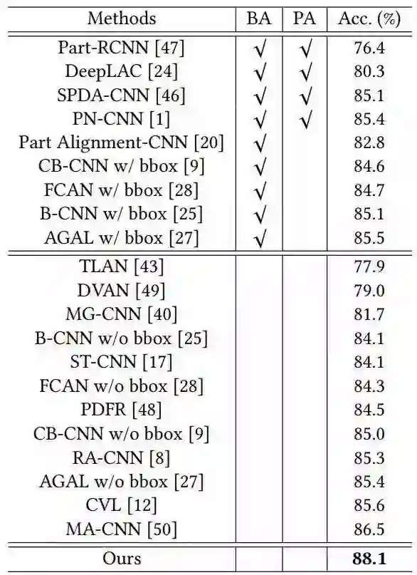表 1. HSE 框架与其它引入额外信息的算法在 CUB 数据集上的首位识别准确率对比。