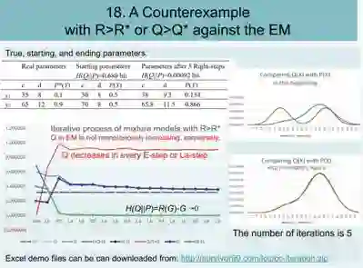 回答是:EM算法收敛证明中第二条,Q(.)只增不减也错了!原来在E步,Q(.)和F(.)是可能减小的!一般情况下都会使Q(.)向真模型的Q*=-H*(X,Y)靠拢,使F(.)向-H*(X|Y)靠拢。如果调整P(Y),收敛就更加可靠,EM算法就变为CM算法。