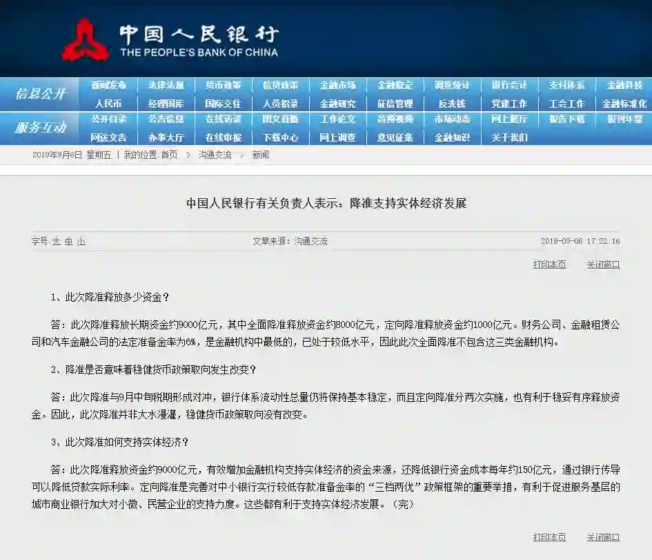 央行有关负责人表示,此次降准释放长期资金约9000亿元,其中全面降准释放资金约8000亿元,定向降准释放资金约1000亿元。