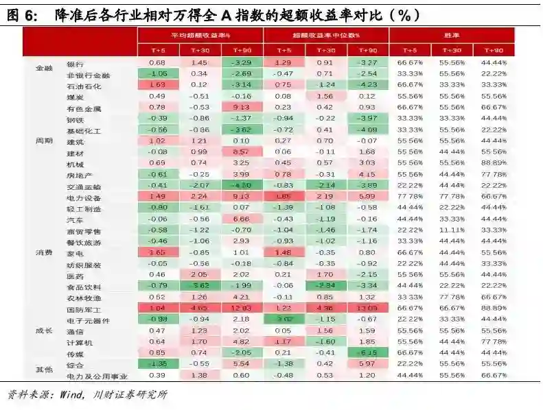 (1)从降准后5个交易日的板块涨跌幅来看,国防军工、家电、石油石化、电力设备板块相对万得全 A 指数的超额收益率平均值排名靠前,分别为1.84%、1.65%、1.63%、1.49%;