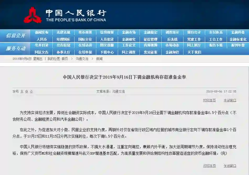 为支持实体经济发展,降低社会融资实际成本,中国人民银行决定于2019年9月16日全面下调金融机构存款准备金率0.5个百分点(不含财务公司、金融租赁公司和汽车金融公司)。